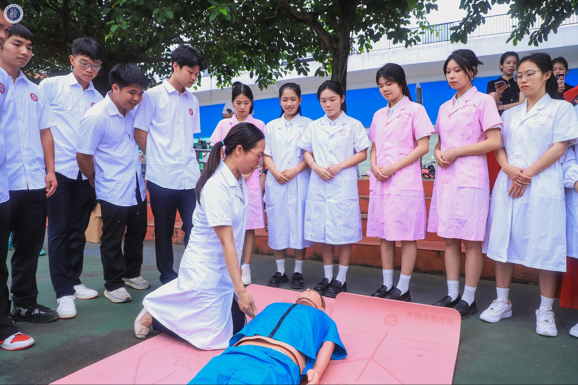 活动场上,师生同乐。不仅有精彩的节目表演,还有现场专业教学:有美术作品展示,现场手工工艺作品制作;有急救技能,由人民医院资深医师教学海姆立克、心肺复苏技能。同学们积极参与,感受不一样的专业学习。