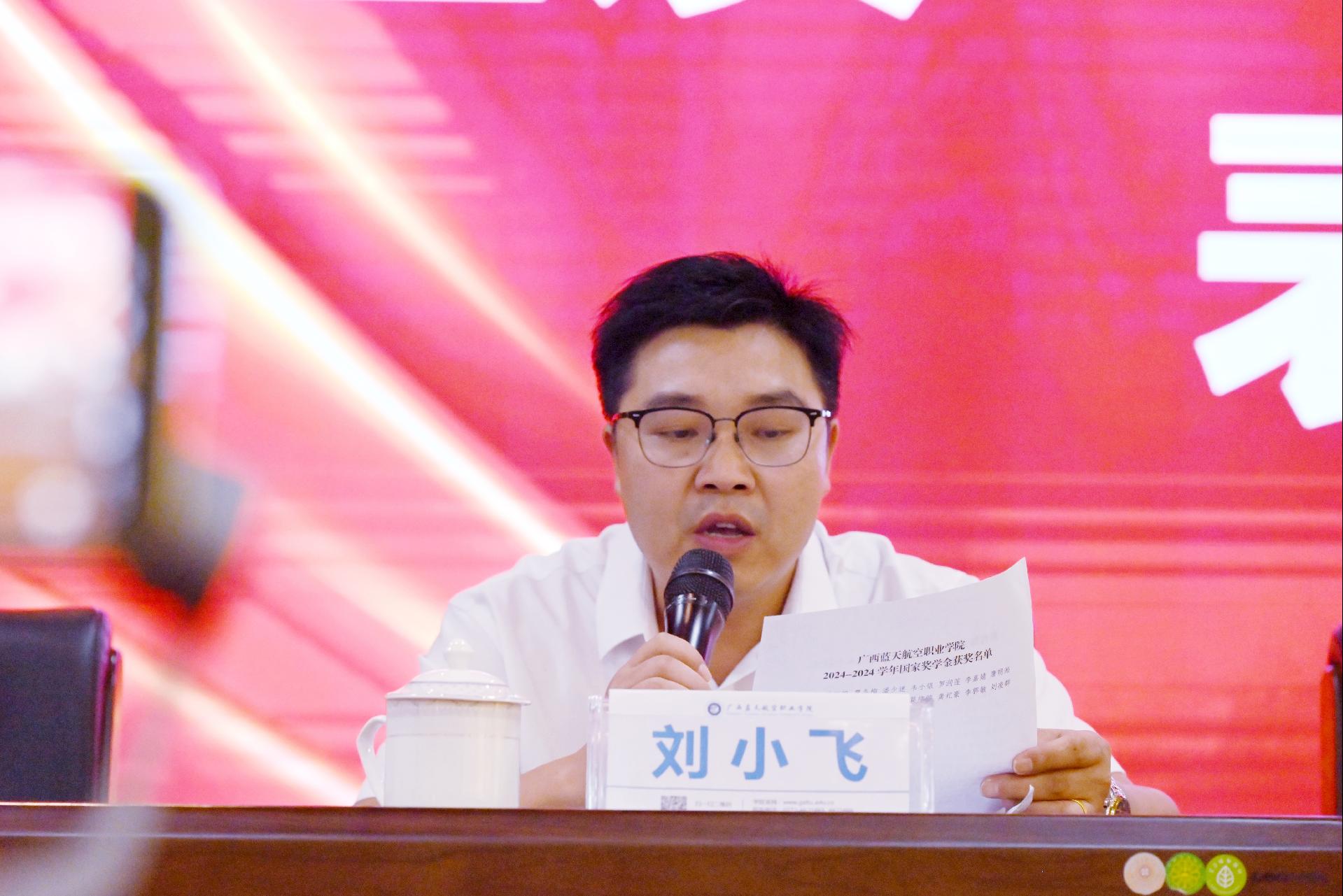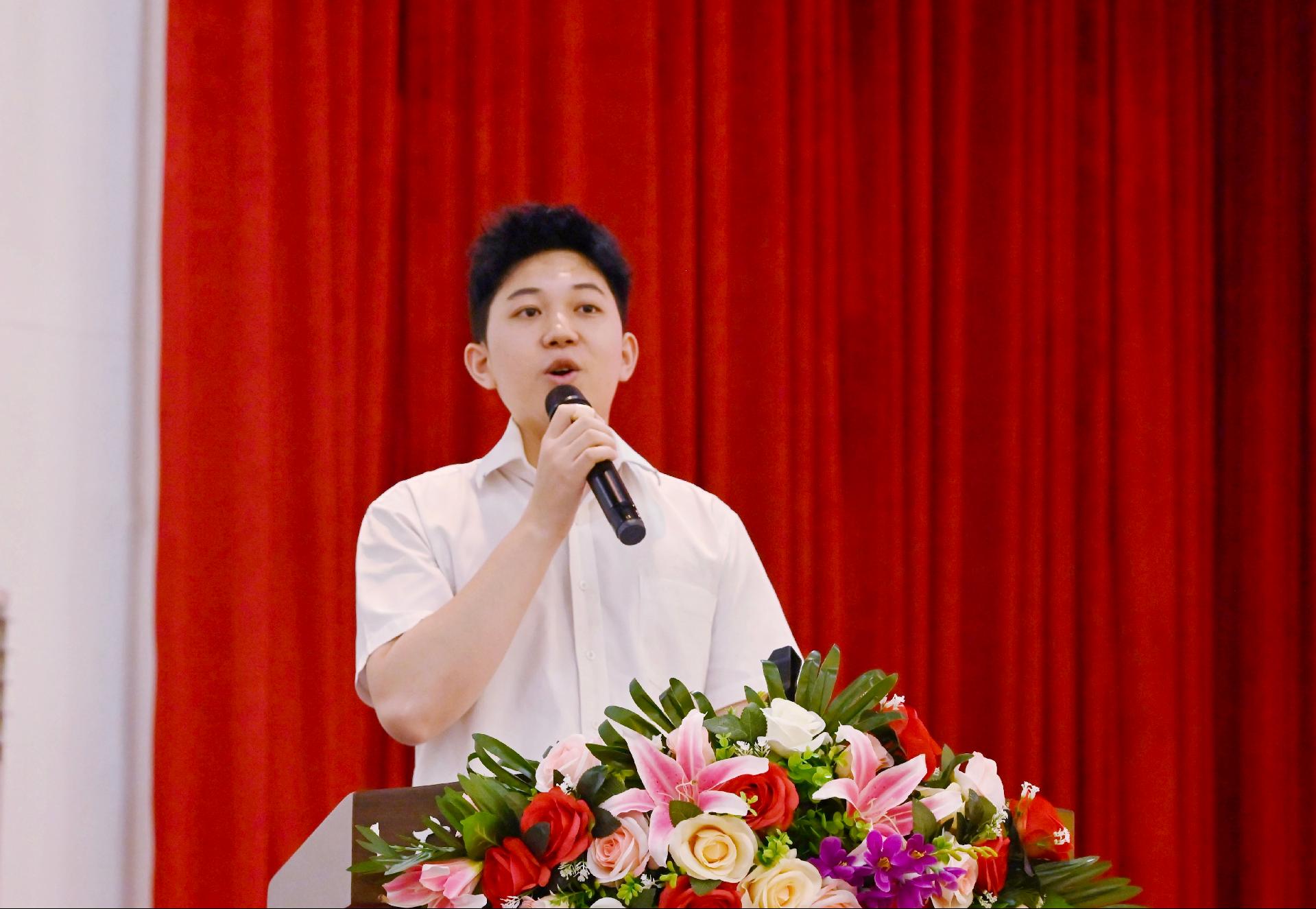 自治区优秀毕业生、航空信息技术学院莫国裕同学作为毕业生代表发言。他讲述了自己在校学习期间的收获与感悟,表达了对母校、老师、同窗的感谢之情。他表示作为新时代青年,要肩负时代赋予的使命,以青春之名,赴时代之约,在更广阔的舞台上书华丽篇章。