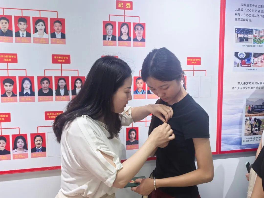 团徽是中国共产主义青年团的标志,团员证是团员身份的证明。校团委书记黎柳为新团员佩戴团徽,并颁发团员证。