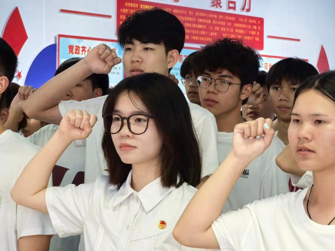 在领誓人覃添恒同学的带领下,新团员们面向团旗,高举右手,庄严宣誓。团员们声音洪亮、字字铿锵,誓言响彻会场,表达了他们加入共青团的坚定决心和对共青团组织的无限忠诚。